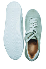 Suede low-top sneakers in a light green, mint, or sage color with white laces and white rubber soles|Casual low-top sneaker.