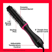 Achieve a sleek, frizz-free look with the Revlon One Step Root Booster Round Brush Dryer and Hair Styler. This versatile tool adds volume and fights frizz as it effortlessly dries and styles your hair in one step. Featuring a 1-1/2 inch barrel, it's perfect for creating bouncy, voluminous hairstyles.