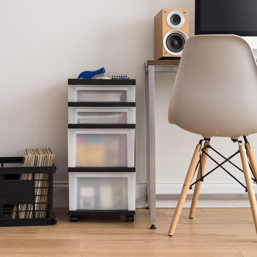 Ver todos los detallesIRIS USA Plastic Drawer Storage Organizer Rolling Cart, with Wheels Casters, 4-Drawers, for Classroom Art Craft Supplies Dresser Closet Bathroom Laundry Room, Black/Pearl