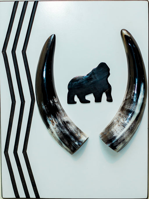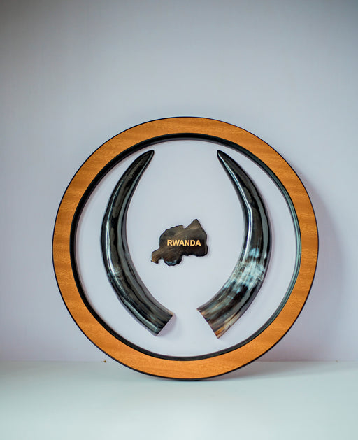 ASCOM marketTwo authentic cow horns mounted in a handcrafted wooden frame, featuring an engraved 'Rwanda' inscription and Tree of Life design. This striking 60...